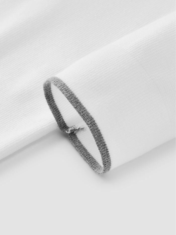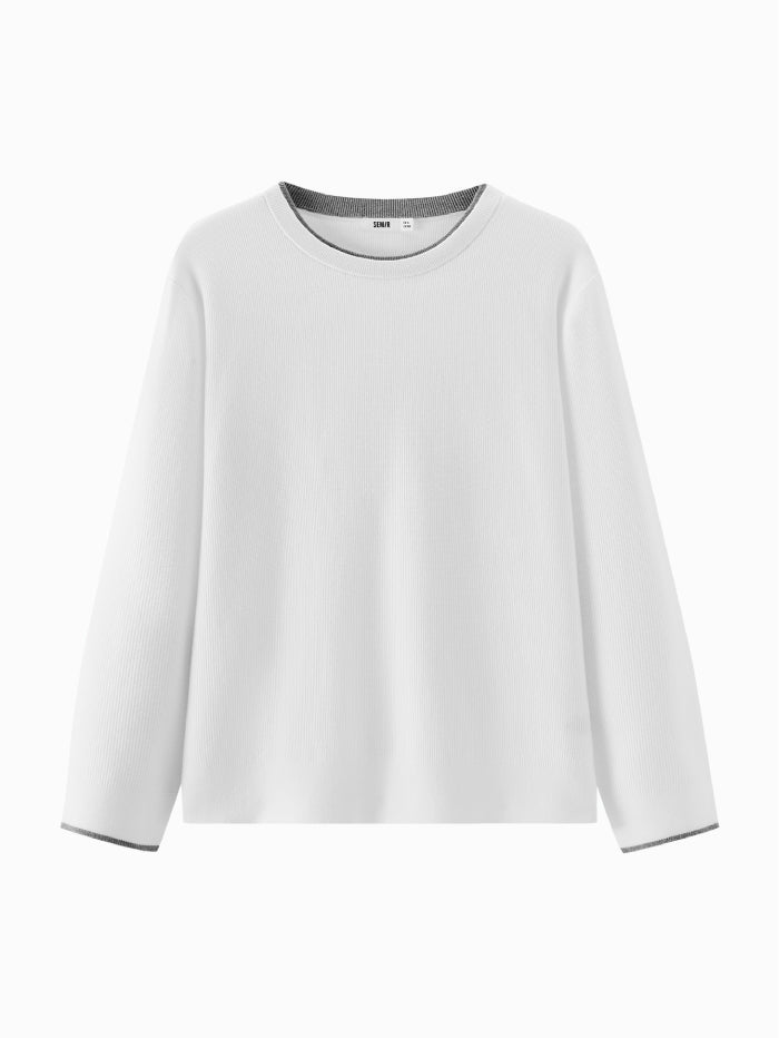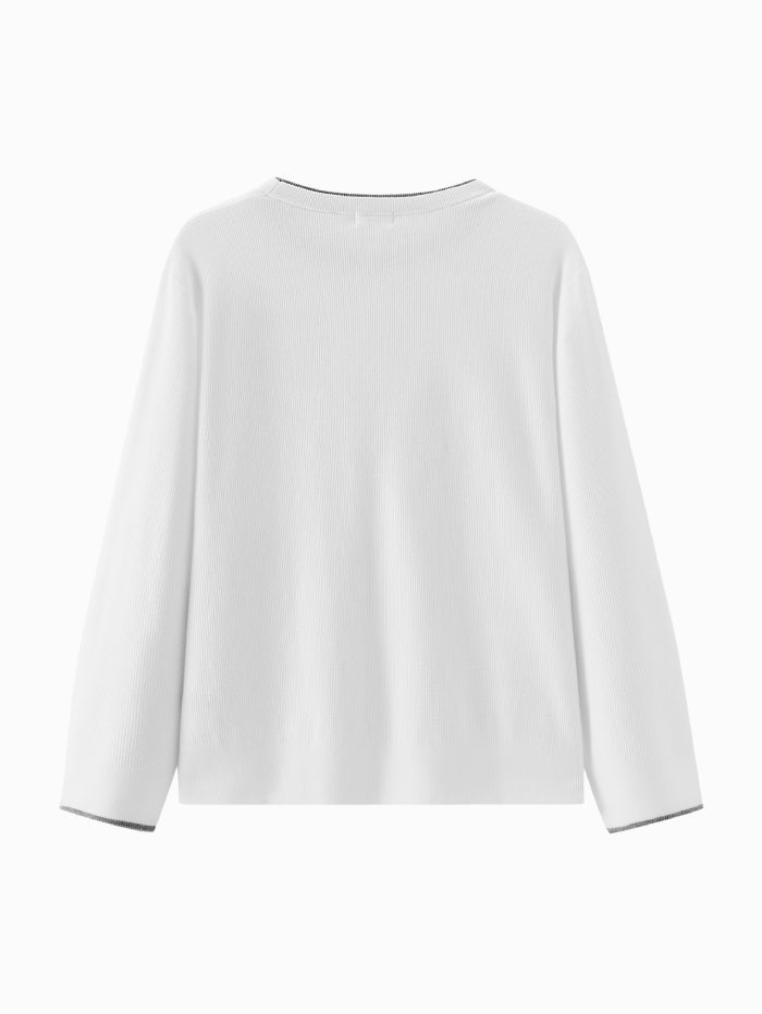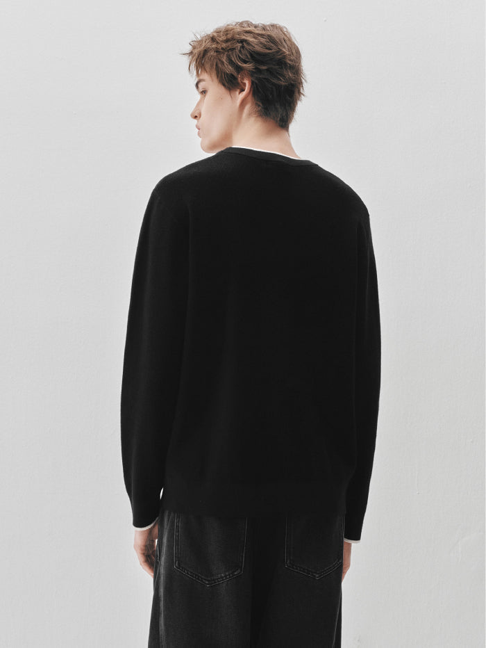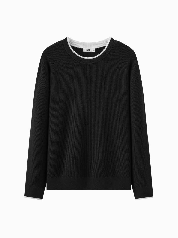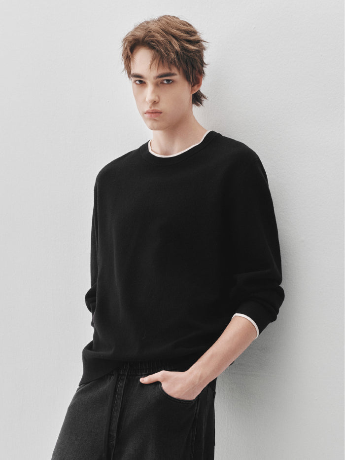 Minimalist knitted pullover featuring a crew neckline and subtle contrast trim on the collar and cuffs. A versatile long sleeve design ideal for layering or standalone wear.