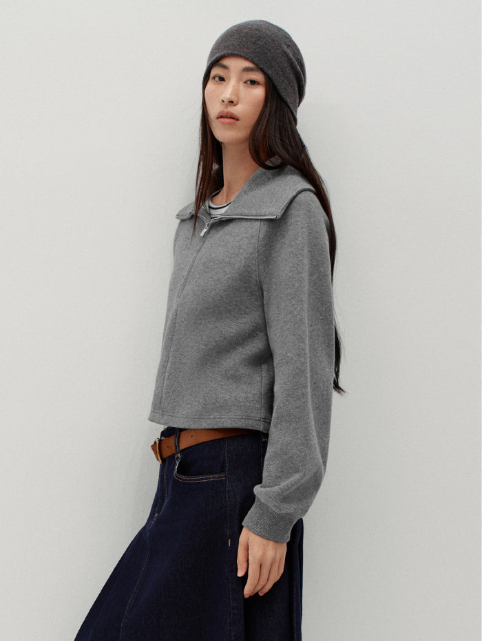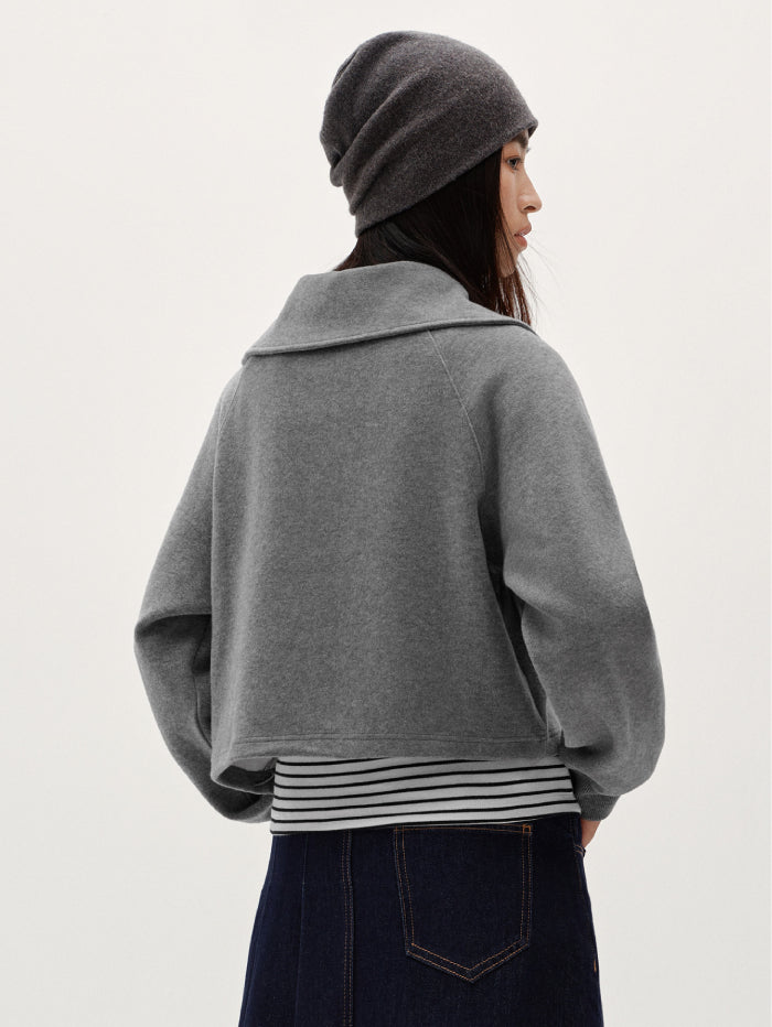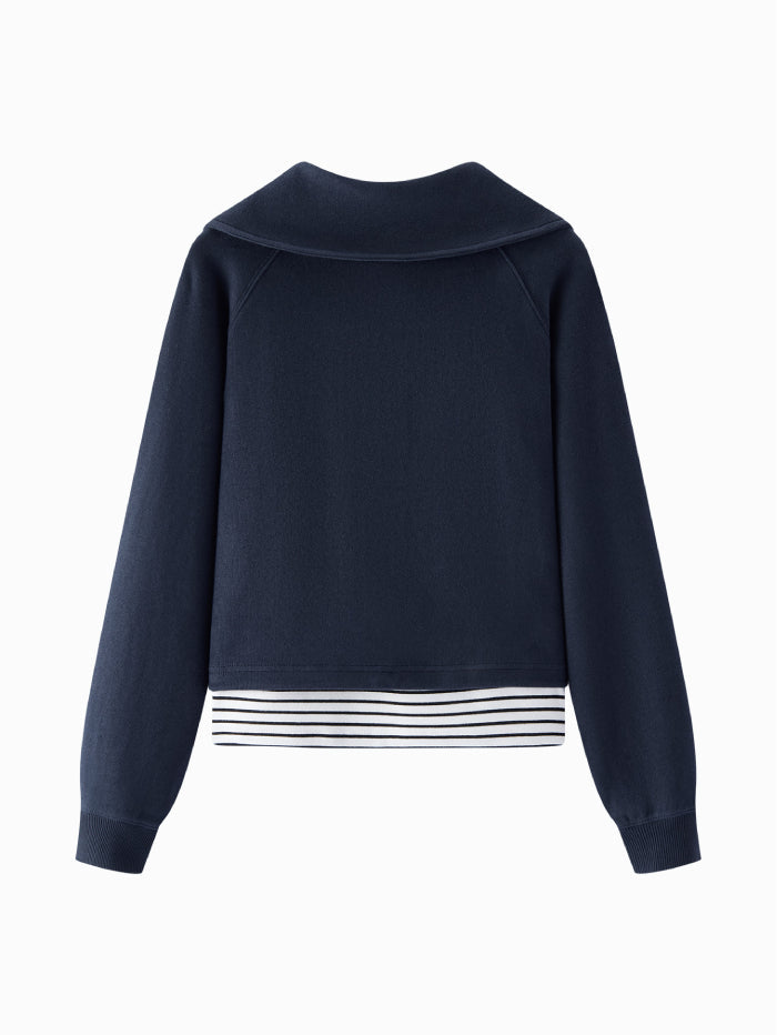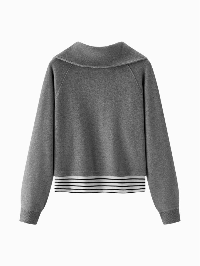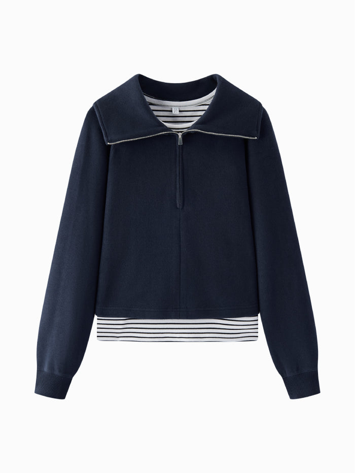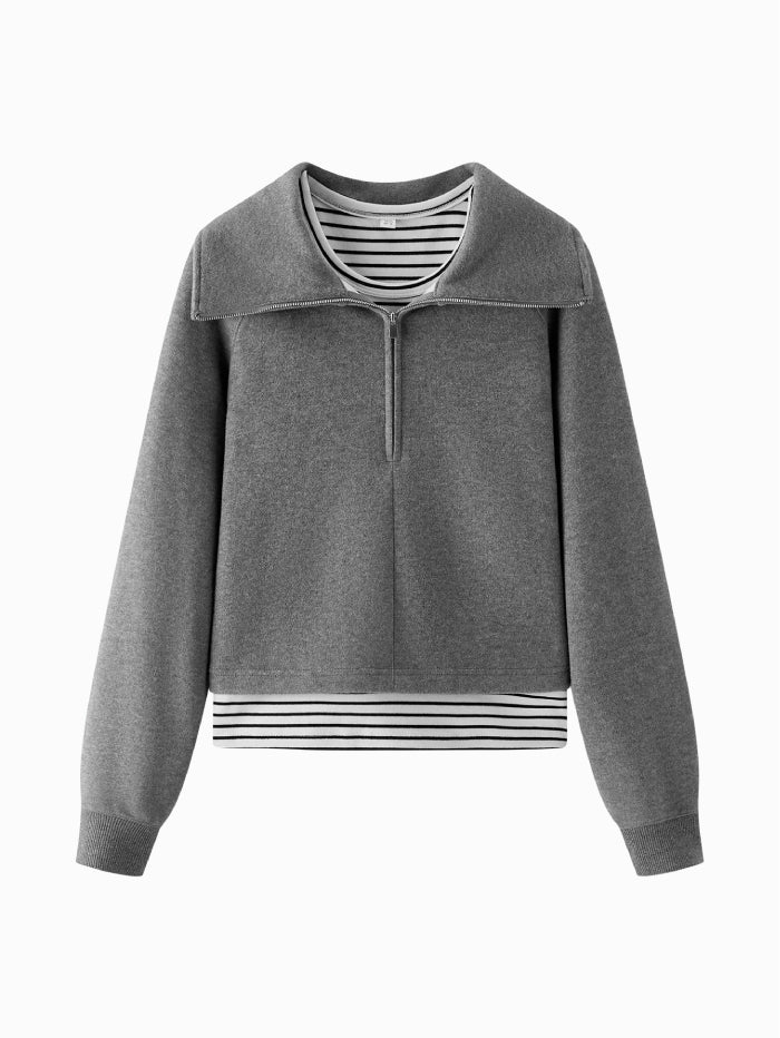 A modern sweatshirt featuring a wide collar with half zip detail, paired with an inner striped tank for a layered effect. Designed with long sleeves and a relaxed fit, making it a versatile and stylish choice for everyday wear.
