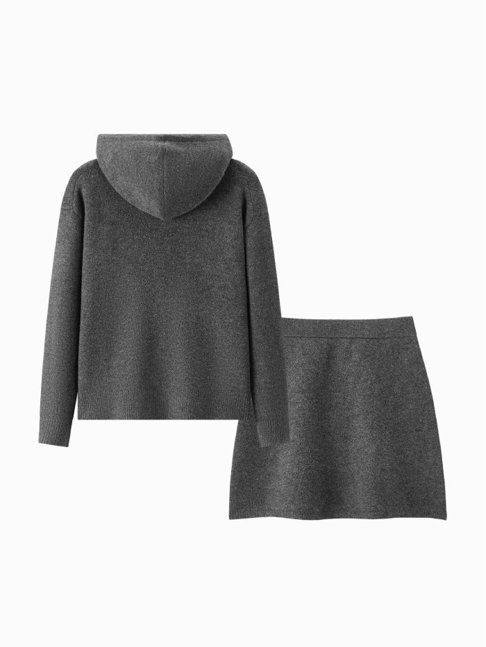 A matching set featuring a cozy knitted hoodie with drawstring detail and a straight fit mini skirt. Designed for both comfort and a coordinated look, this set is perfect for casual outings or relaxed indoor wear.