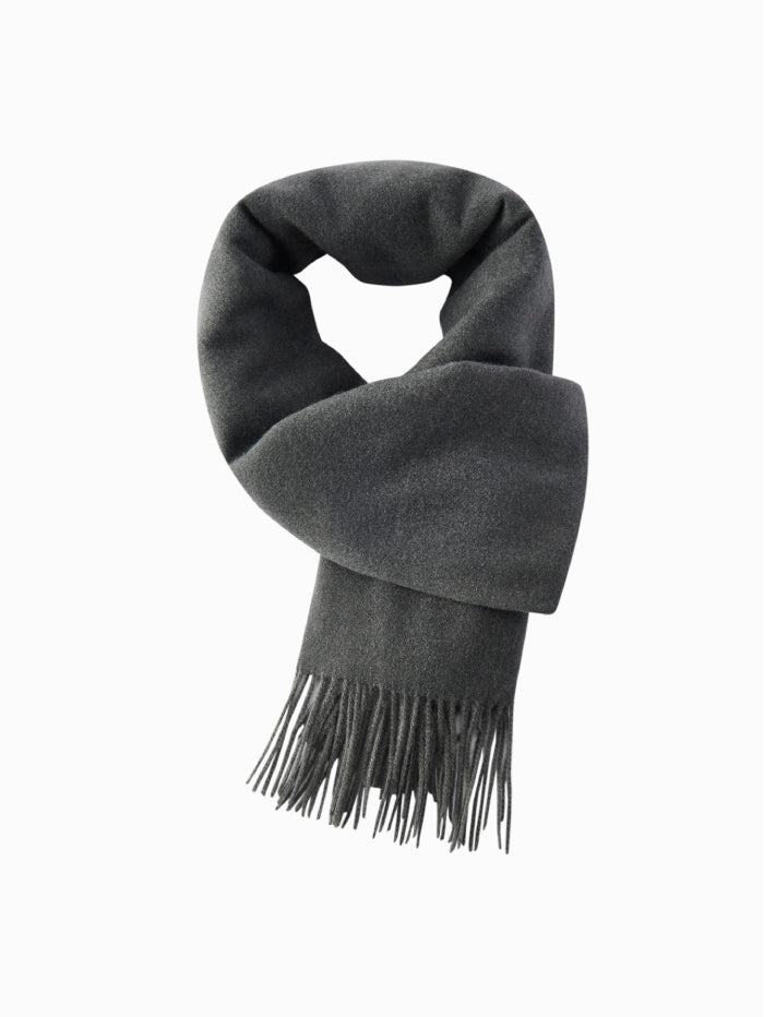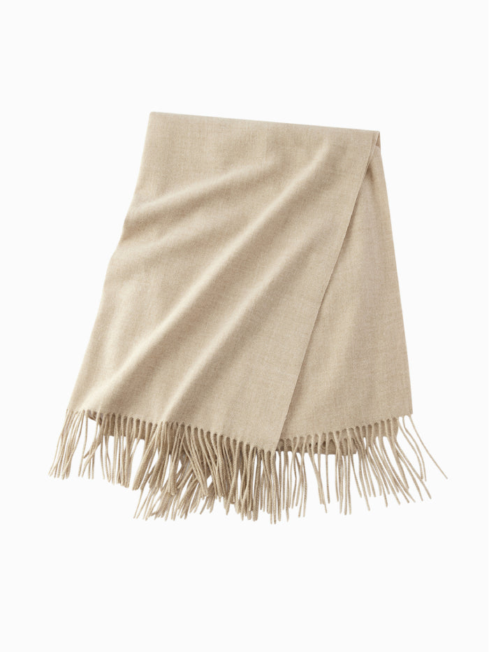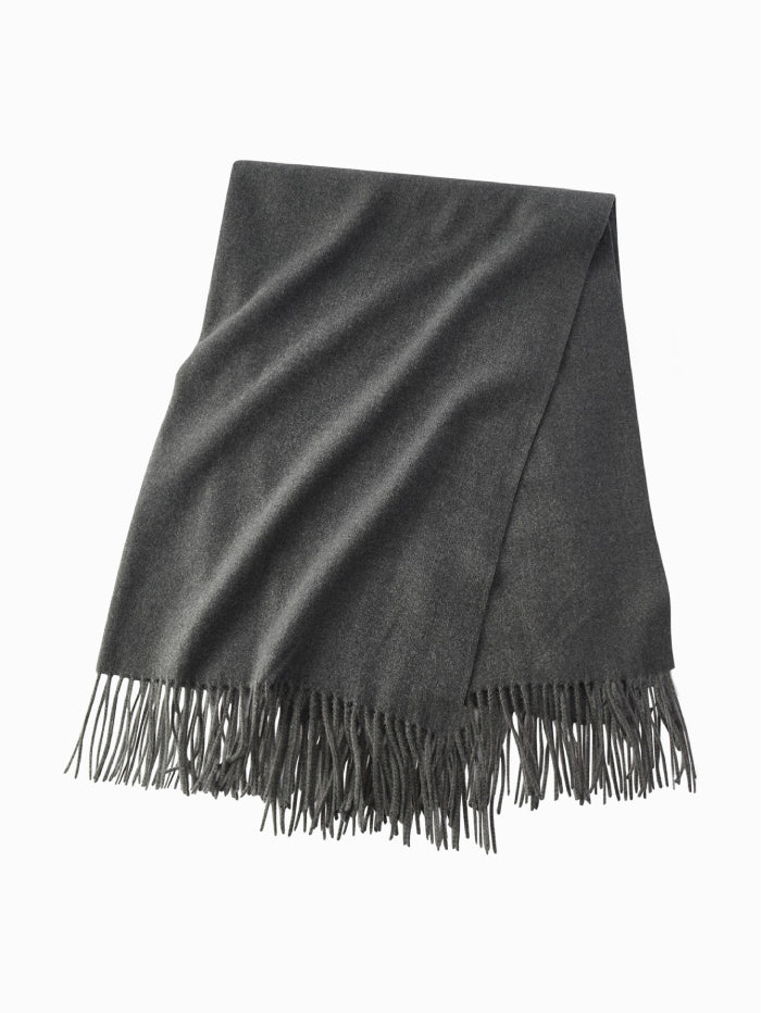 A minimalist scarf crafted from a soft fabric, finished with delicate fringes at the edges. Its timeless design makes it an easy to style accessory that adds warmth and refinement to everyday outfits.