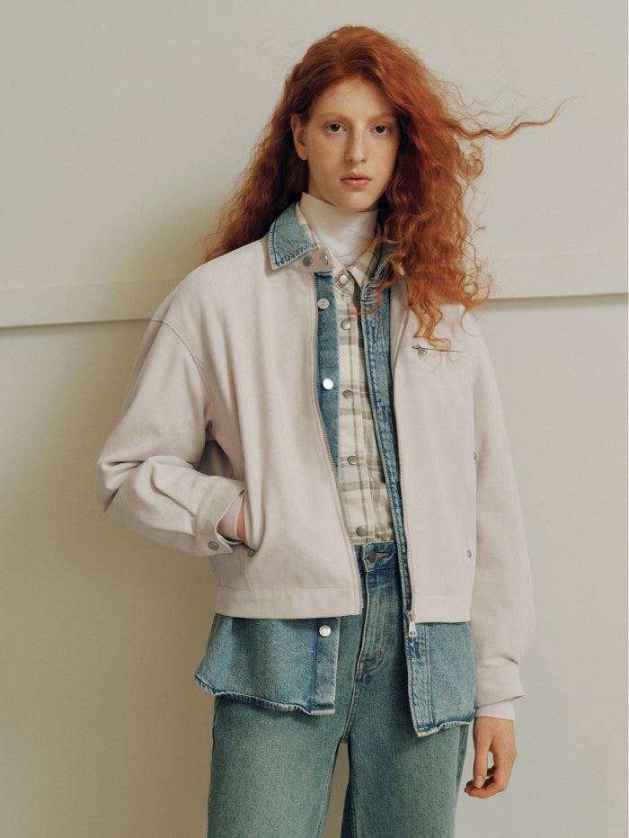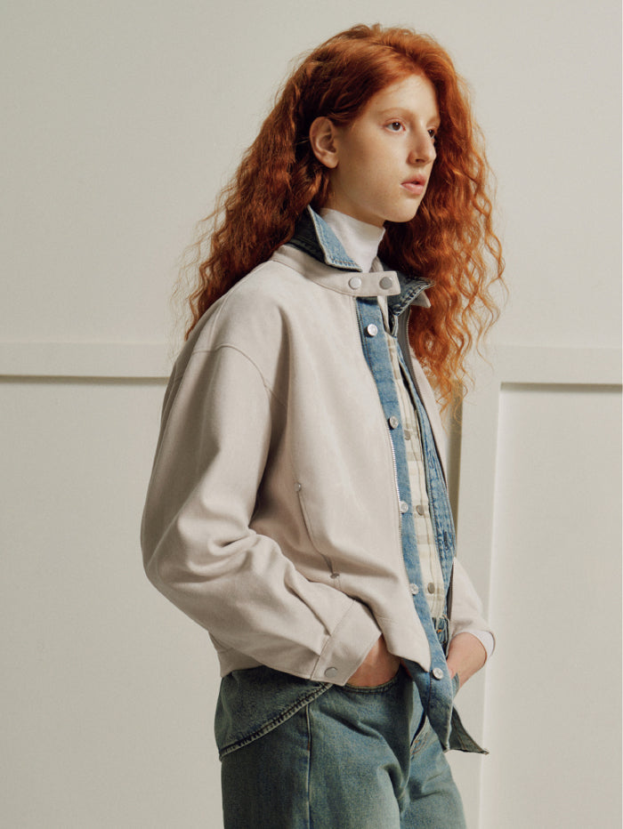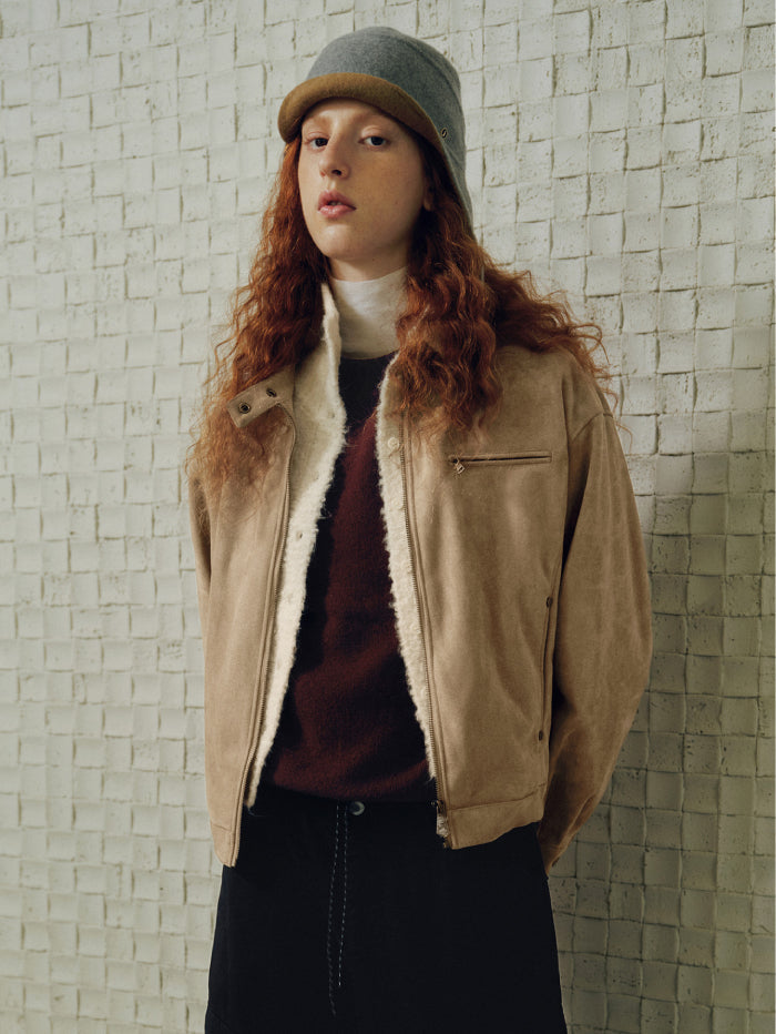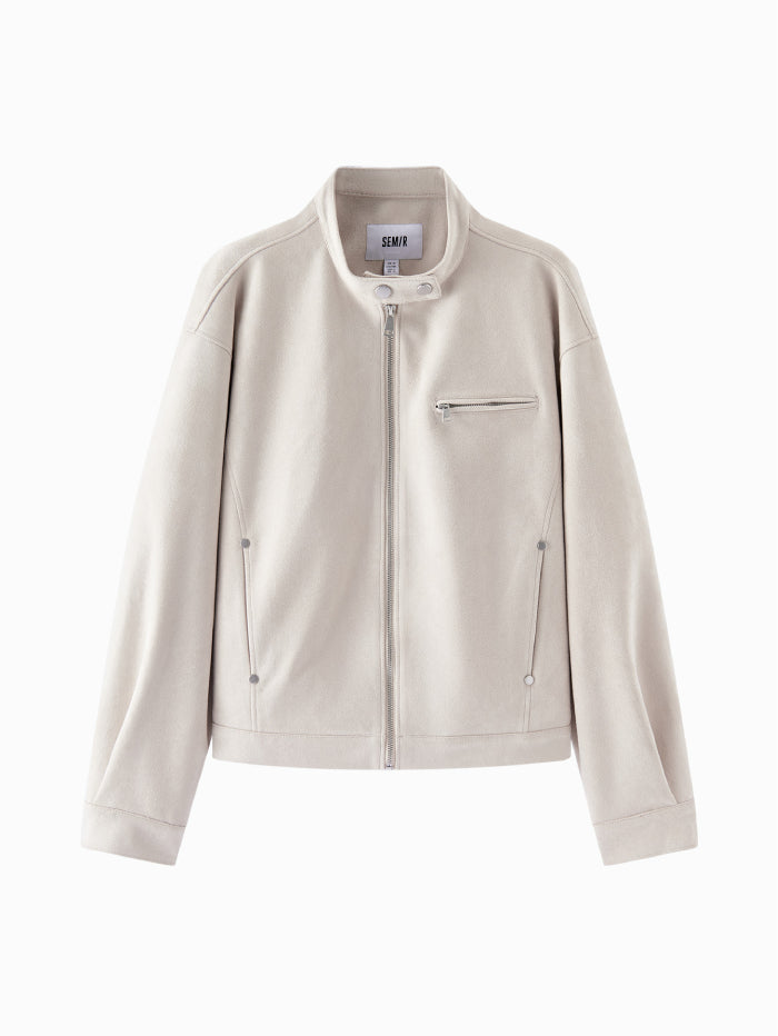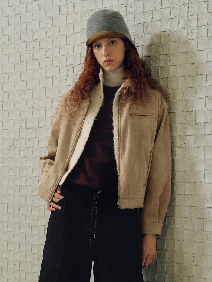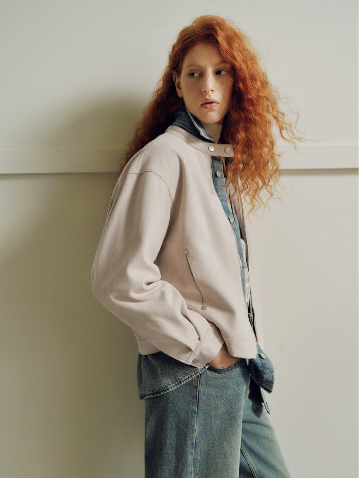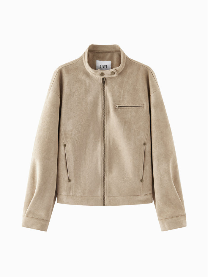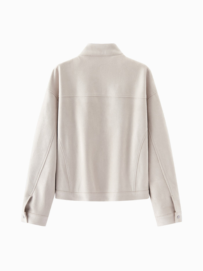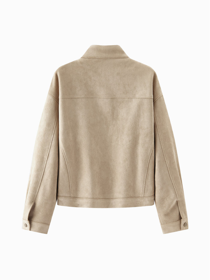 جاكيت أنيق بملمس شامواه ناعم، مزود بسحاب أمامي وياقة بإغلاق كبس، مع جيوب متعددة تجمع بين العملية والطابع العصري.