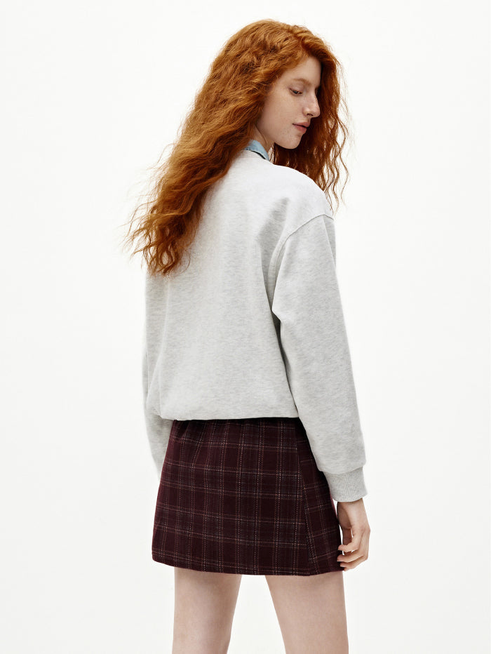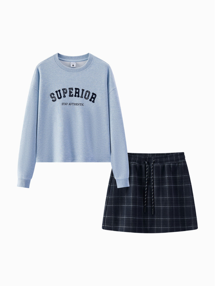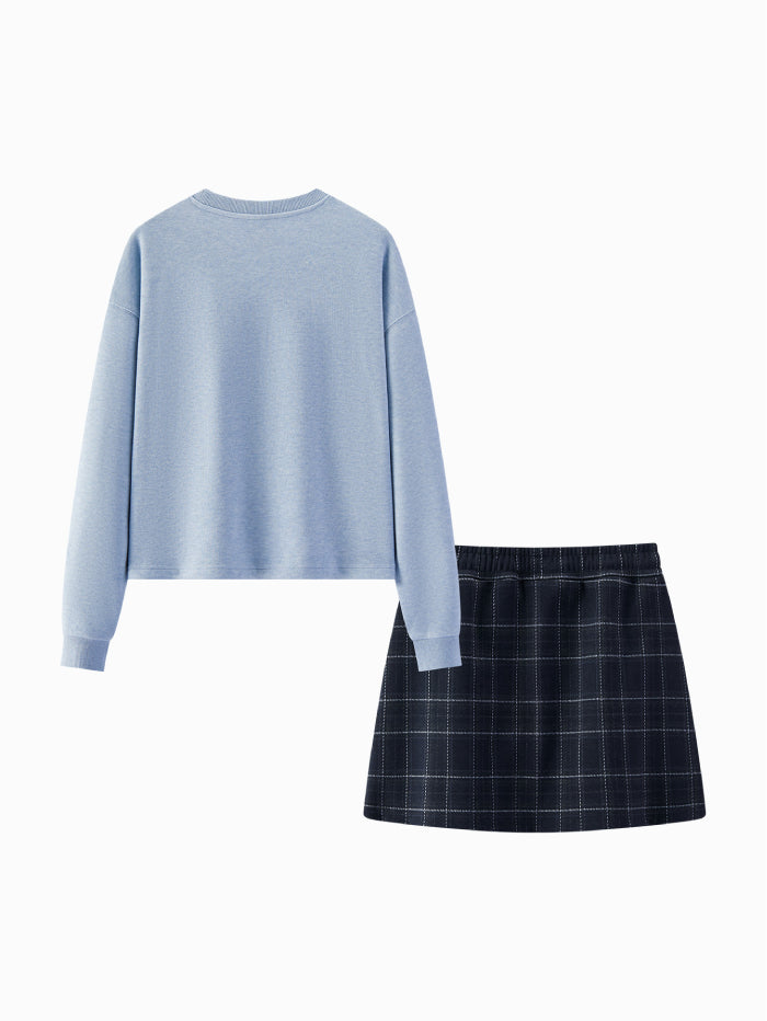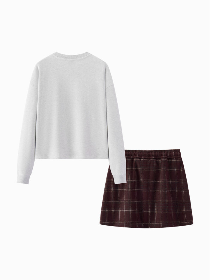طقم مريح من تريكو يتكون من توب بأكمام طويلة وياقة دائرية مع تنورة بقصة مستقيمة لإطلالة أنيقة وعملية يومية.