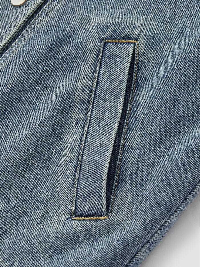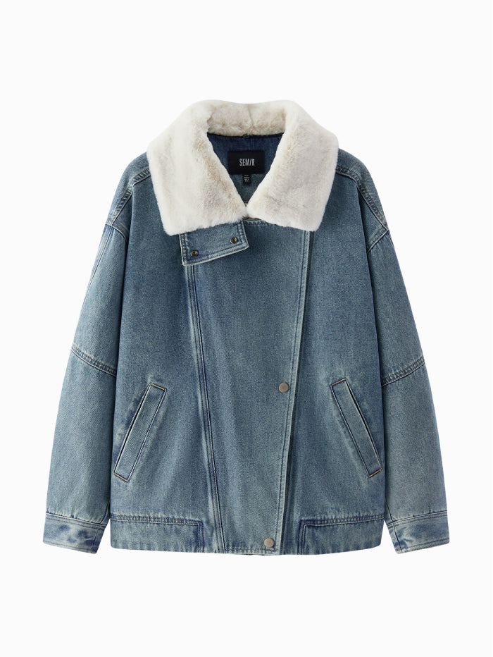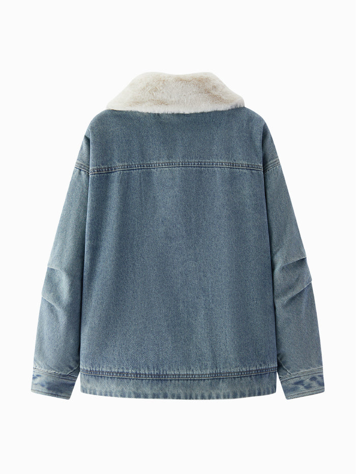 جاكيت دنيم أنيق مزوّد بياقة فرو صناعي ناعمة تمنح دفئًا وإحساسًا بالراحة. يتميز بجيوب جانبية وإغلاق بكبسات أمامية، ليجمع بين الأسلوب الكاجوال واللمسة الدافئة، مثالي للارتداء في الأجواء الباردة.