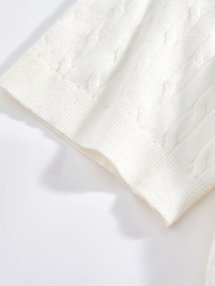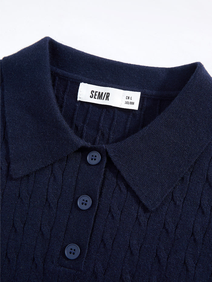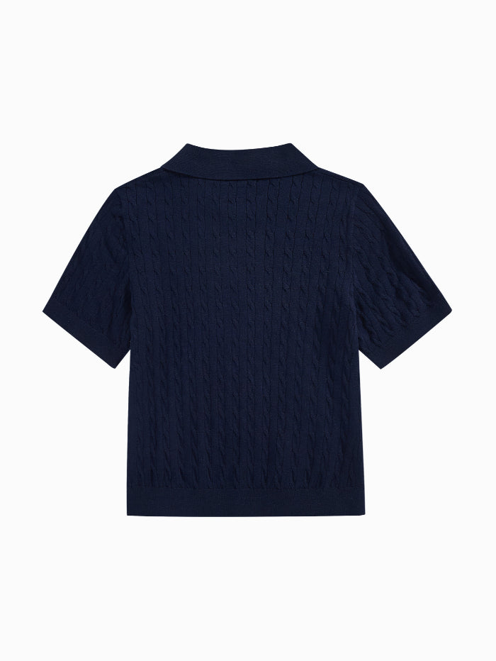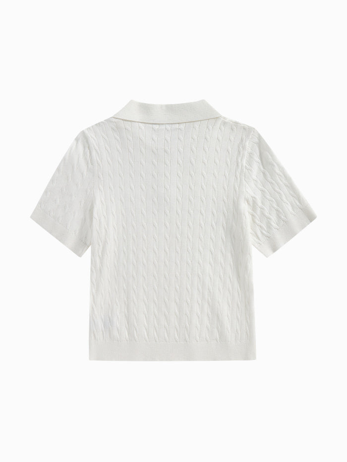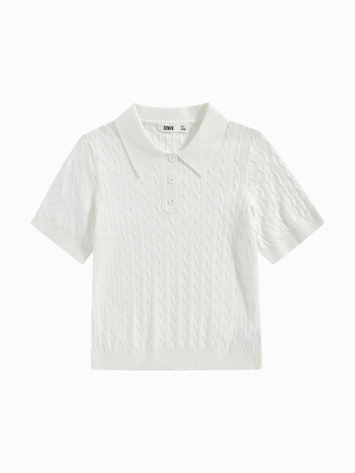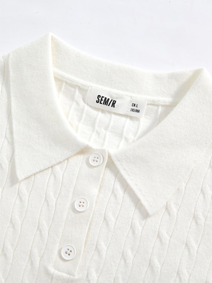 تتميز هذه البلوزة بأكمام قصيرة بنسيج محبوك بلون موحد وخامة ذات نسيج منقوش مميز، مع ياقة كلاسيكية وأزرار عند الرقبة لإضافة لمسة أنيقة وسهولة في الارتداء. مثالية للمناسبات الكاجوال والذكية الكاجوال.